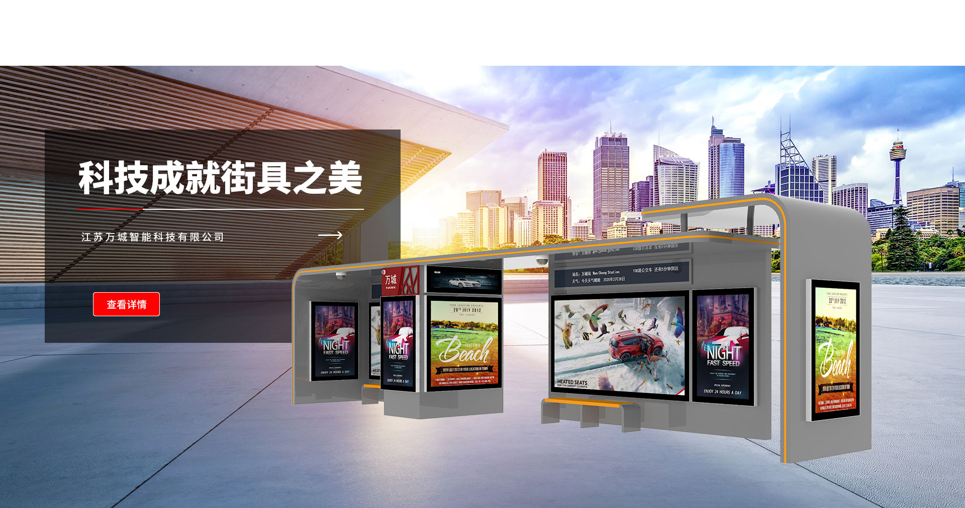 江蘇萬城智能科技有限公司是一家專業從事候車亭、公交站臺、公交候車亭生產制造廠家,提供項目設計、價格核算、生產安裝一站式服務。產品涵蓋城市、鄉鎮、仿古、中式、不銹鋼、現代、智能等多種候車亭類型。同時根據客戶的需求加工定制各種型號、規格的公交站牌、指路牌、站臺護欄、候車亭座椅等配套設施。萬城智能坐落于風景秀麗的西楚霸王項羽故鄉,在江蘇省宿遷經濟開發區振興大道東側,蘇州路南側(原三鼎織造院內13-14號廠房)。